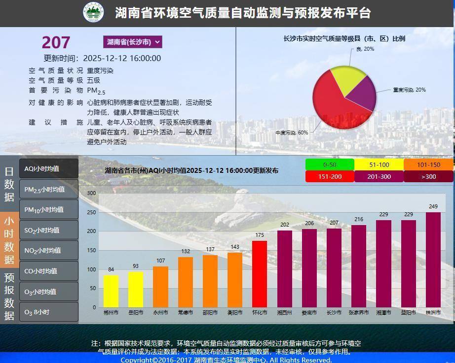 △截至12月12日下午4点天创网,长沙空气质量状况为重度污染。图片来源:湖南省生态环境监测中心