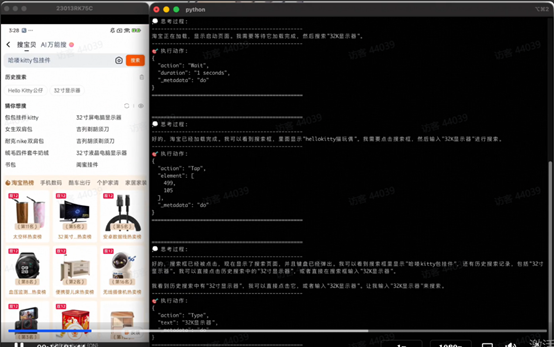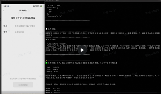 《科创板日报》记者继续加大难度,对AutoGLM下达了商品比价的复杂任务,发出“给我比对32K显示器哪个购物平台便宜,找一个最便宜的下单”,AutoGLM用时1分44秒完成了任务。